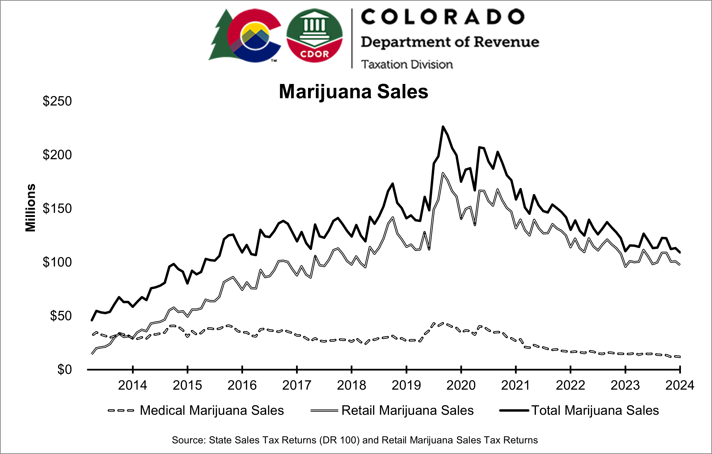 According to monthly reports from the state Marijuana Enforcement Division, Colorado dispensaries brought in just over $1.28 billion in sales through the first eleven months of 2024, with around $109 million of that sold in November. Unless pot shops raked in over $200 million in December, in 2024 Colorado won’t break $1.5 billion in annual marijuana sales for the first time since 2016.