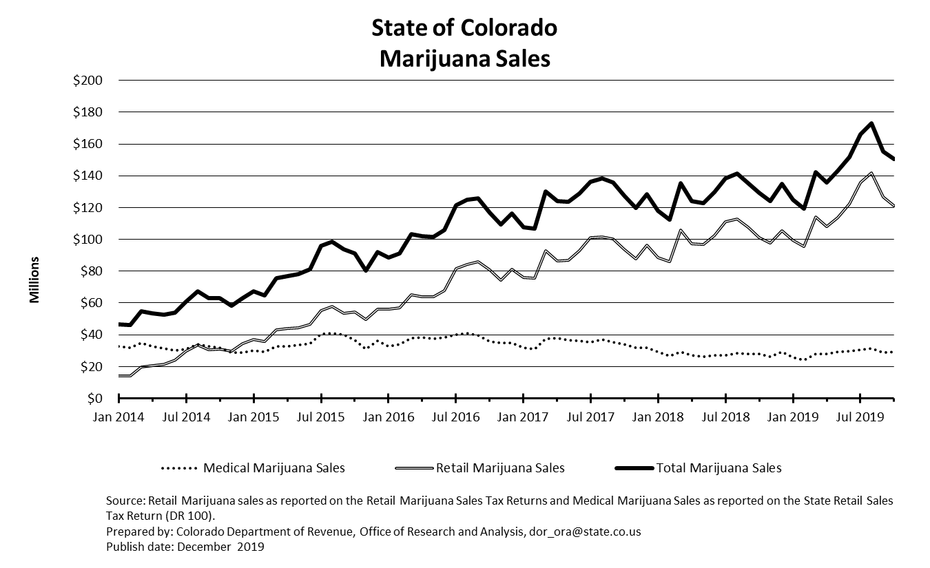 According to data from the state Department of Revenue, Colorado dispensaries accounted for just under $150.5 million in sales in October. Recreational pot sales came in just over $121.2 million, while medical marijuana accounted for approximately $29.2 million.