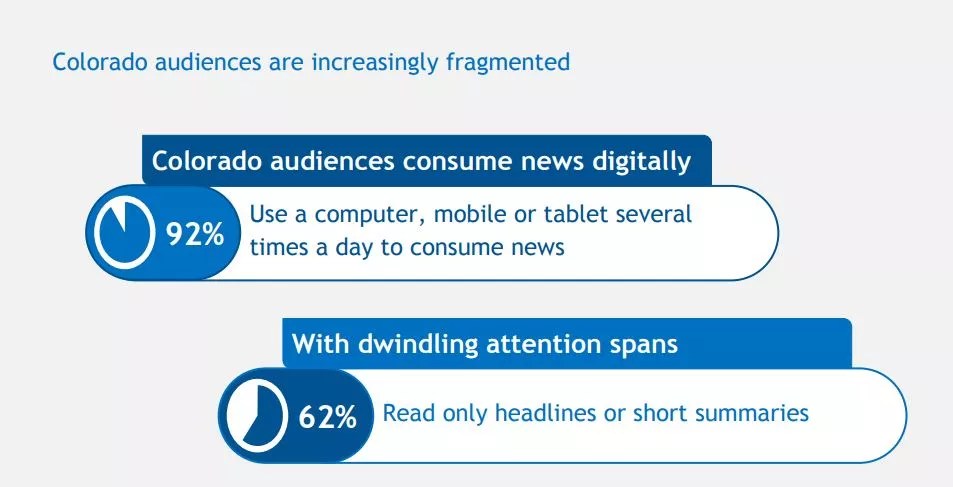 The survey found that 62 percent of Colorado consumers only read headlines and short summaries of articles. And 92 percent of all consumers get their news on digital platforms.