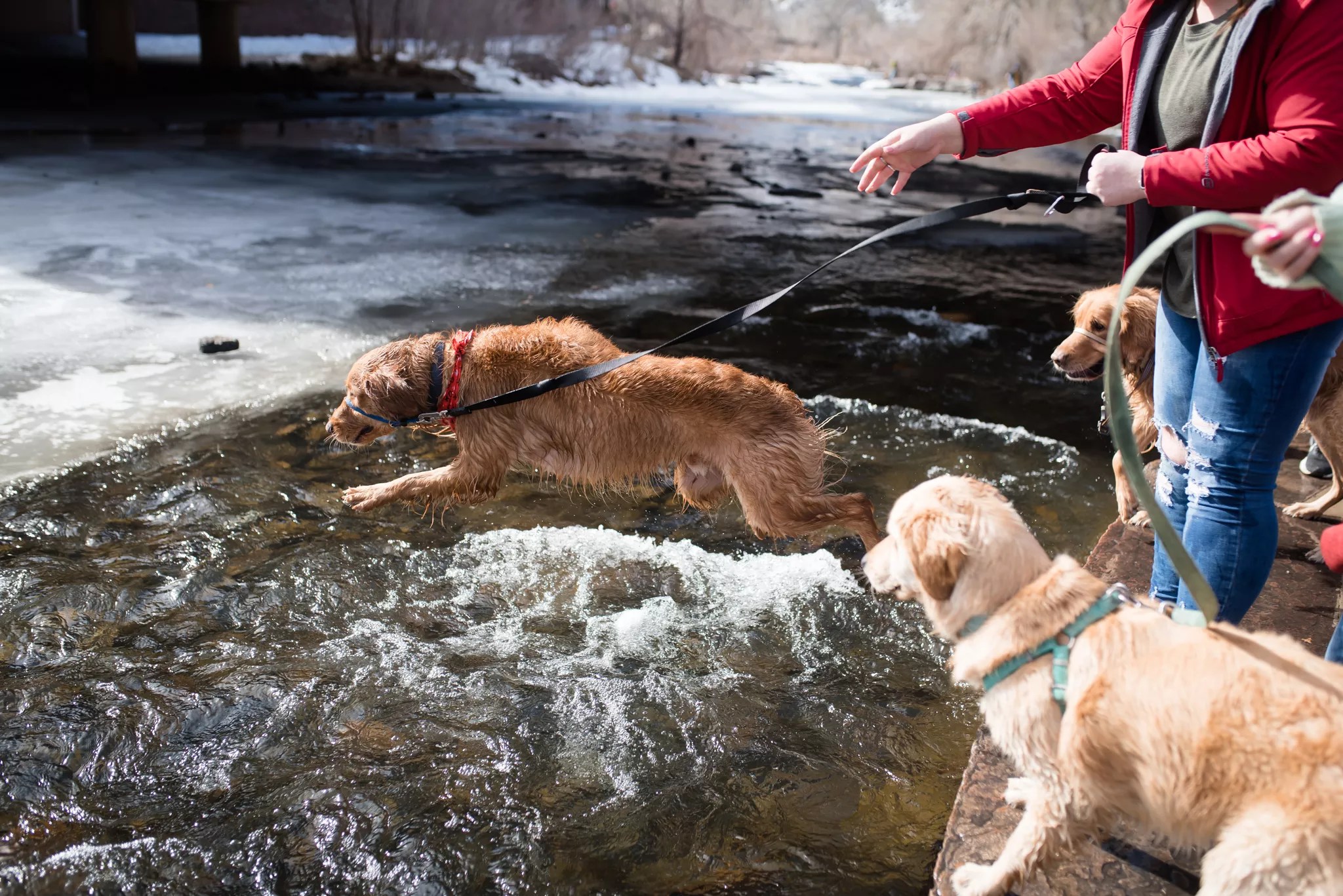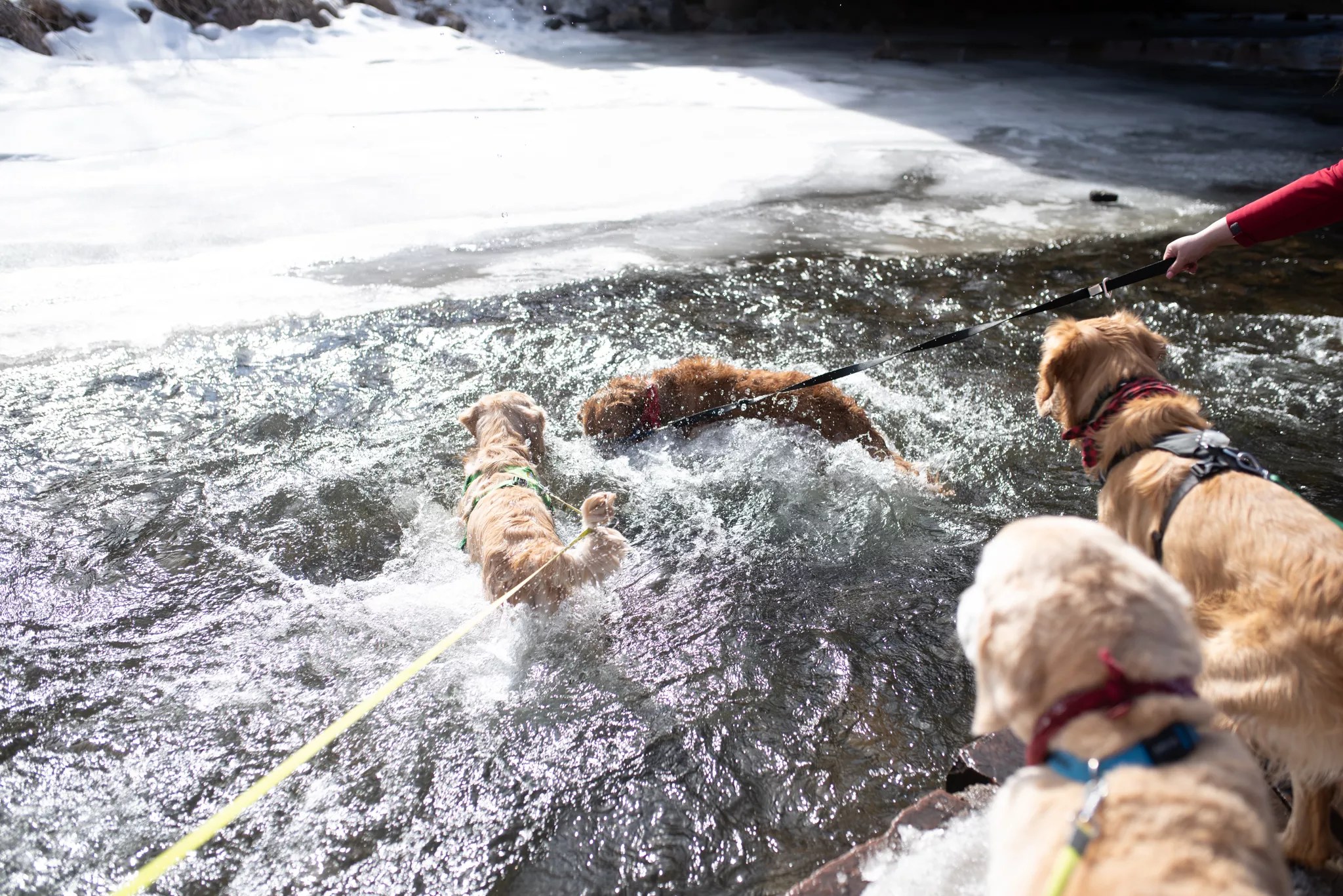 “The first year we held this event, we had counters and tried to have an official count, but as you can imagine, that was impossible,” Meadows says. “So now we are hands-down the unofficial world-record holder for the world’s largest gathering of a single dog breed. There is one in Scotland, which has an annual event in the birthplace of golden retrievers, but they’ve never had more than 400. And a beach community in L.A. also has a goldens gathering, but they’ve never cracked a thousand.” Goldens are famous for their love of water, and so a dip in Clear Creek was a must for some. Lee Stiffler-Meyer/Let the Light in Studio