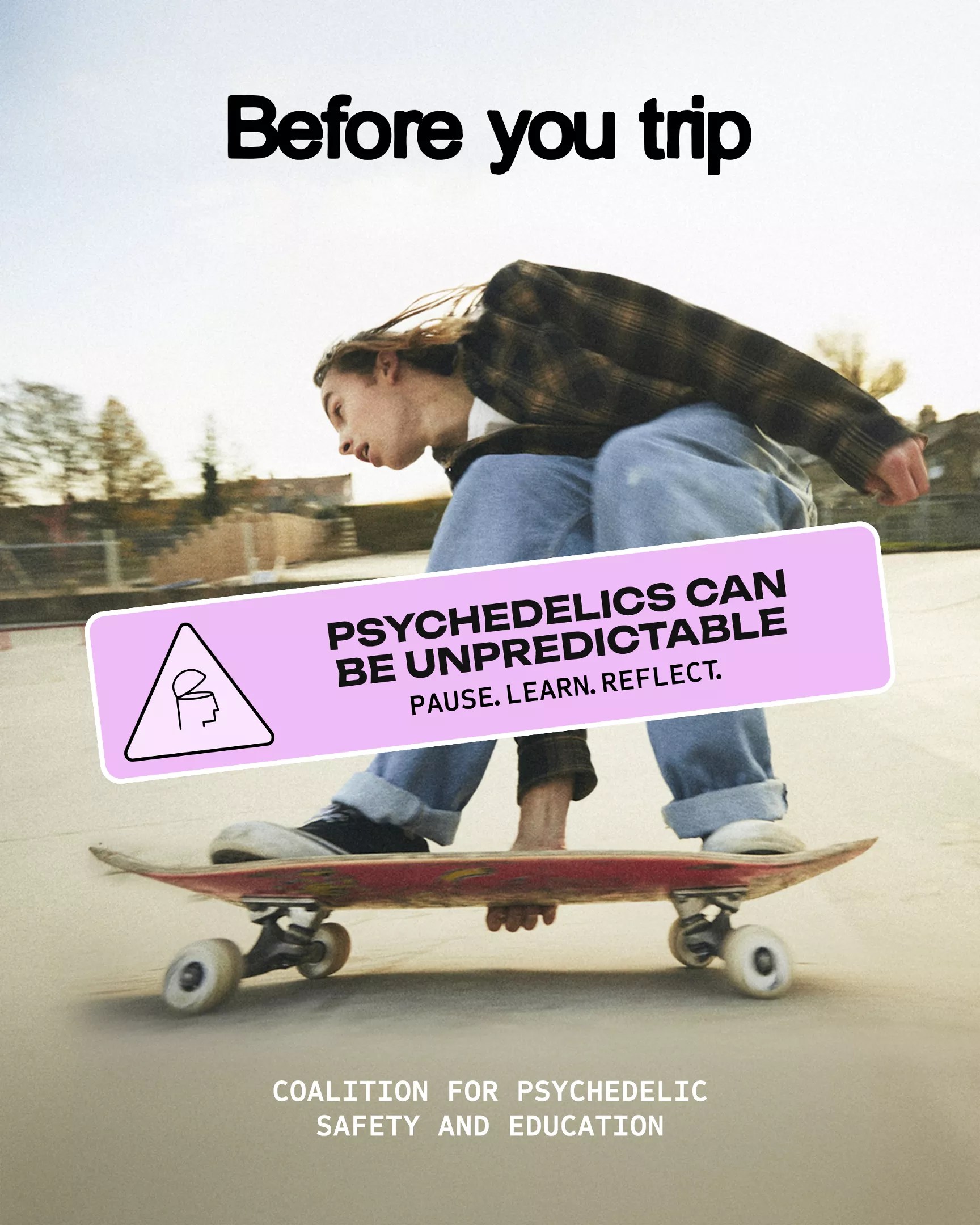 The campaign’s primary feature is the website, beforeyoutrip.org, which leads with the message “Pause. Learn. Reflect. Psychedelics can be powerful tools for self-discovery – but they can also come with unpredictable, sometimes unwanted, and lingering effects.”