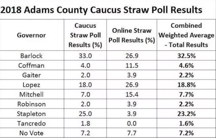 Stapleton didn’t do quite as well in Adams County, where the top choice was Steve Barlock, a businessman who headed the Denver campaign for now-President Donald Trump. Stapleton came in second.