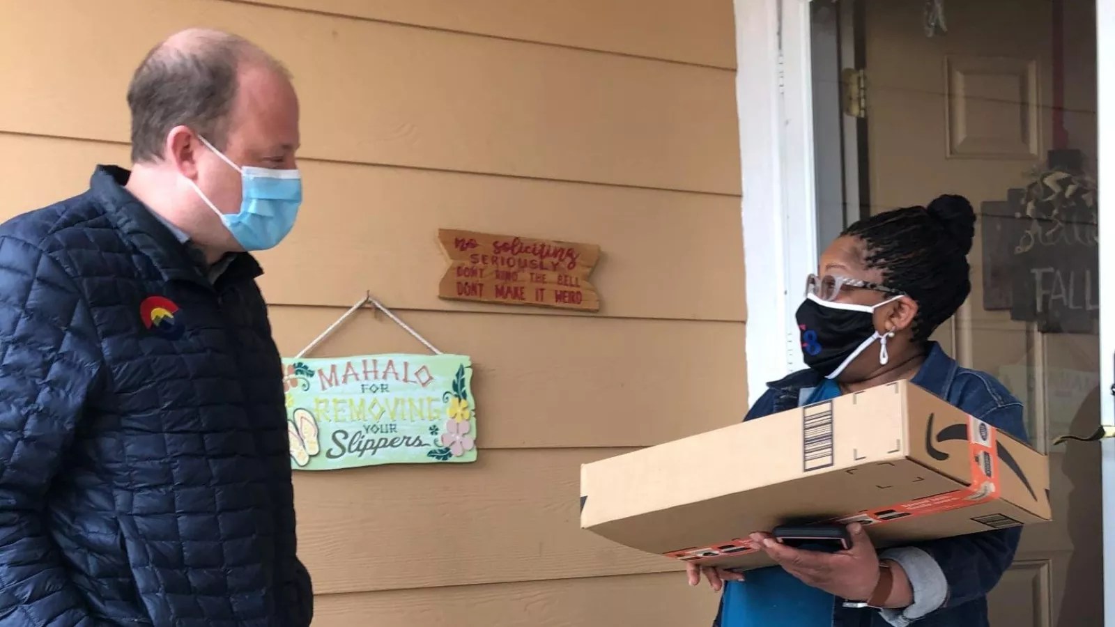 Governor Jared Polis delivering home COVID-19 test kits to a Colorado teacher.