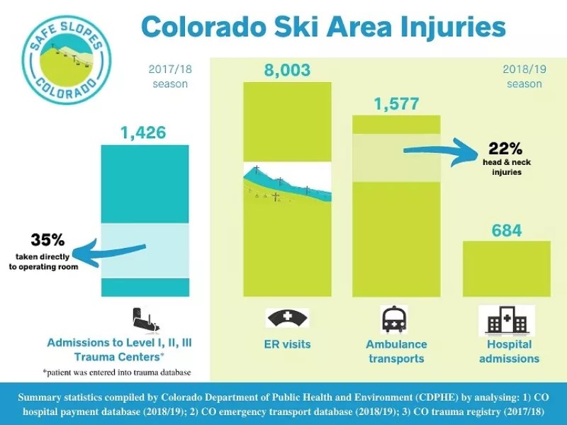 A Safe Slopes Colorado graphic summarizing data from the 2017-2018 ski season.
