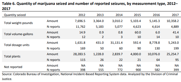 The report includes some jarring statistics about illegal activity, such as criminal cultivations on public land in Colorado and the amount of illegal marijuana seized from such operations. Over 10,350 pounds of illegal pot were seized by Colorado law enforcement in 2017, which is nearly double the 5,145 pounds seized in 2016. Colorado Division of Criminal Justice