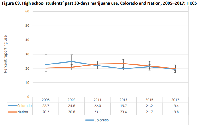 Instances of youth use and impaired driving have decreased after rising in the first few years after legalization, according to the report. The number of Colorado high school students who used marijuana within the past thirty days dropped nearly 2 percent from 2015 to 2017, and has been lower than the national average from 2011 to 2017.