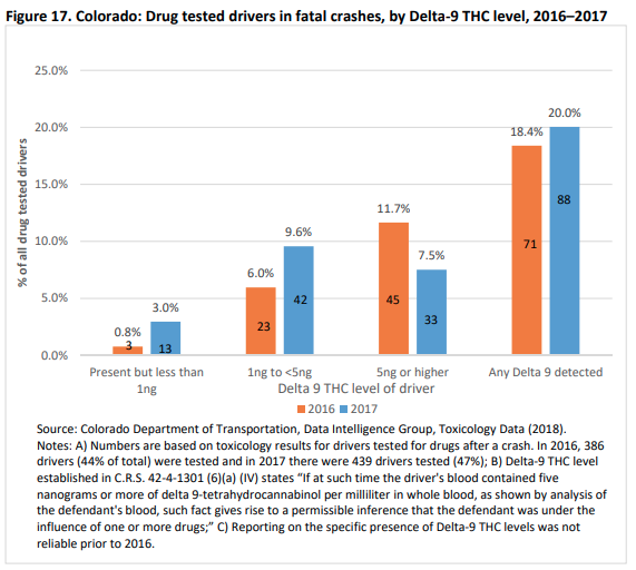 While drivers with THC in their blood undoubtedly increased after legalization, the cannabinoid can stay in a person’s system weeks after consumption, and the Colorado Department of Transportation didn’t start collecting data on active THC in drivers’ blood until 2016. According to the impact report, the number of drivers with active THC in their blood rose slightly from 2016 to 2017, but those with 5 nanograms (the legal limit for driving in Colorado) or more in their blood decreased by more than 4 percent in the same time span.