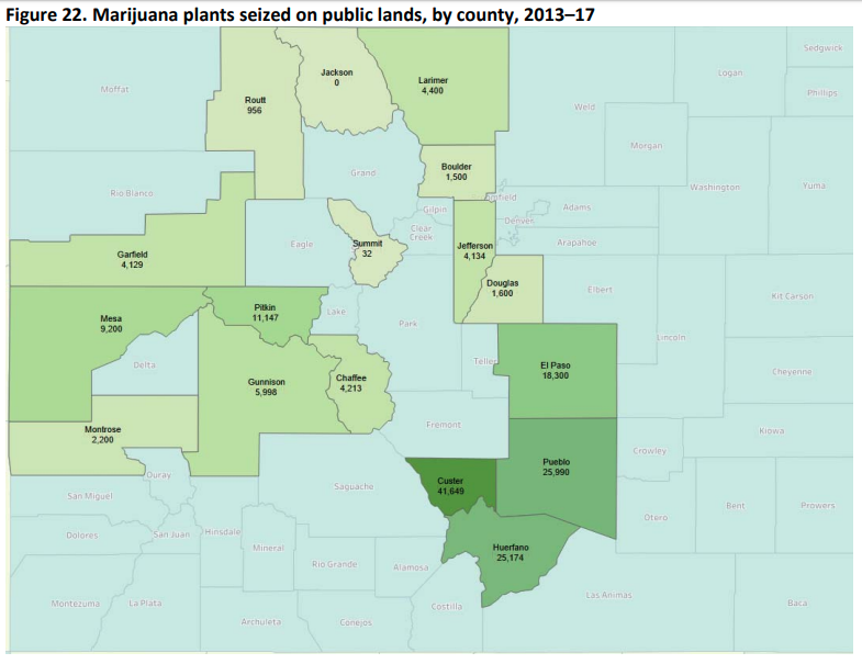 Southern Colorado counties to struggle with illegal operations, the report shows, with Custer, El Paso, Huerfano and Pueblo counties each seeing tens of thousands of illegal pot plants seized on public land in 2017.