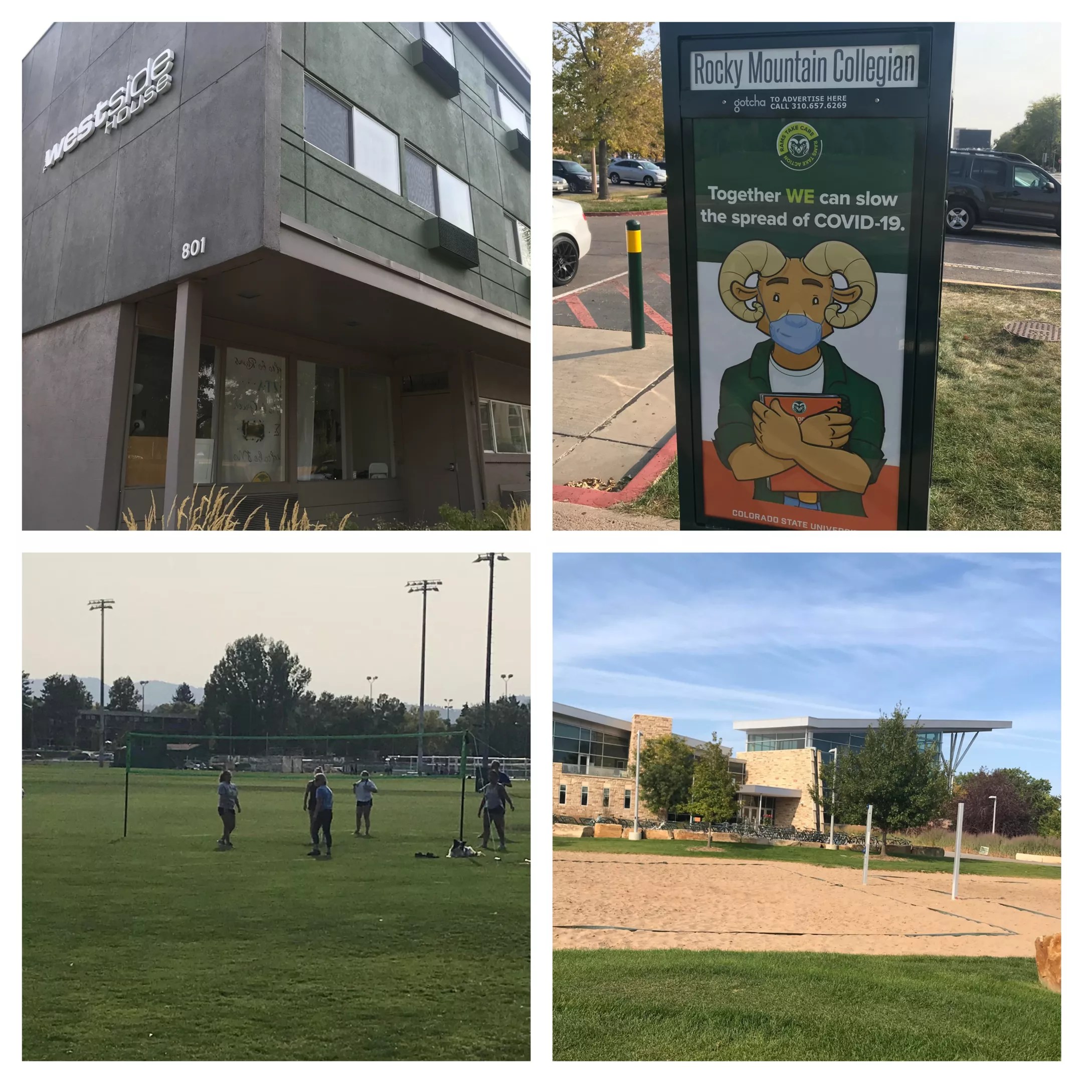 Clockwise from upper left: The CSU Kappa Sigma Fraternity, 801 South Shields Street, has been identified as an outbreak site; mask messaging on the campus; closed volleyball pits forced players to improvise on an athletic field.