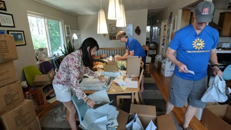 Colorado Sun staffers boxing up T-shirts provided as premiums to Kickstarter donors.