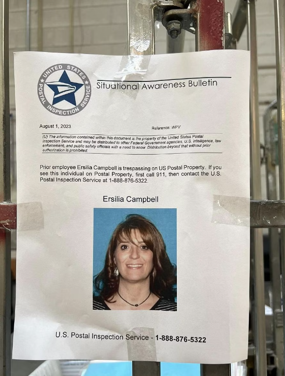 “Prior employee Ersilia Campbell is trespassing on U.S. Postal Property,” the bulletin said.