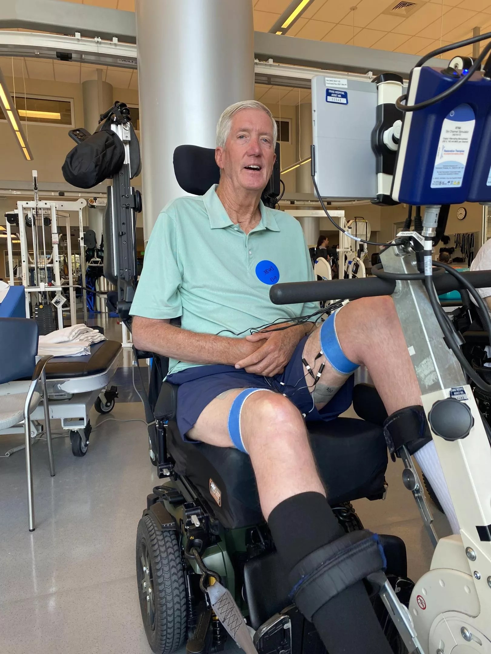 After a break, Enstrom moves on to an exercise bicycle, electrical stimulation pads arrayed on both legs, a screen simulating a path in front of him. At first glance, he isn’t getting anywhere, but that’s an illusion. Every time he pumps his legs, he moves closer to his goal of getting back to the active life he lived before a certain mosquito decided he looked delicious.