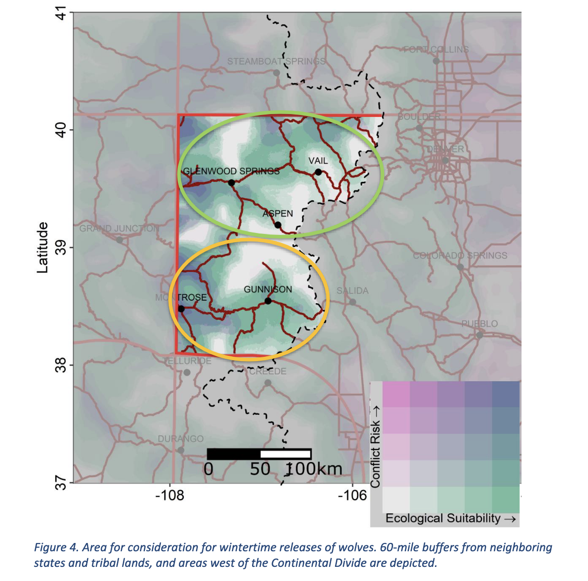 Releases will occur during winter months, and all of the animals will have GPS collars with mortality sensors. The first area to receive wolves next winter will be between the 39th and 40th parallels west of the Continental Divide near Glenwood Springs, Vail and Aspen on state or private land, with the full consent of the landowner. The plan does not consider releasing wolves on federal land.