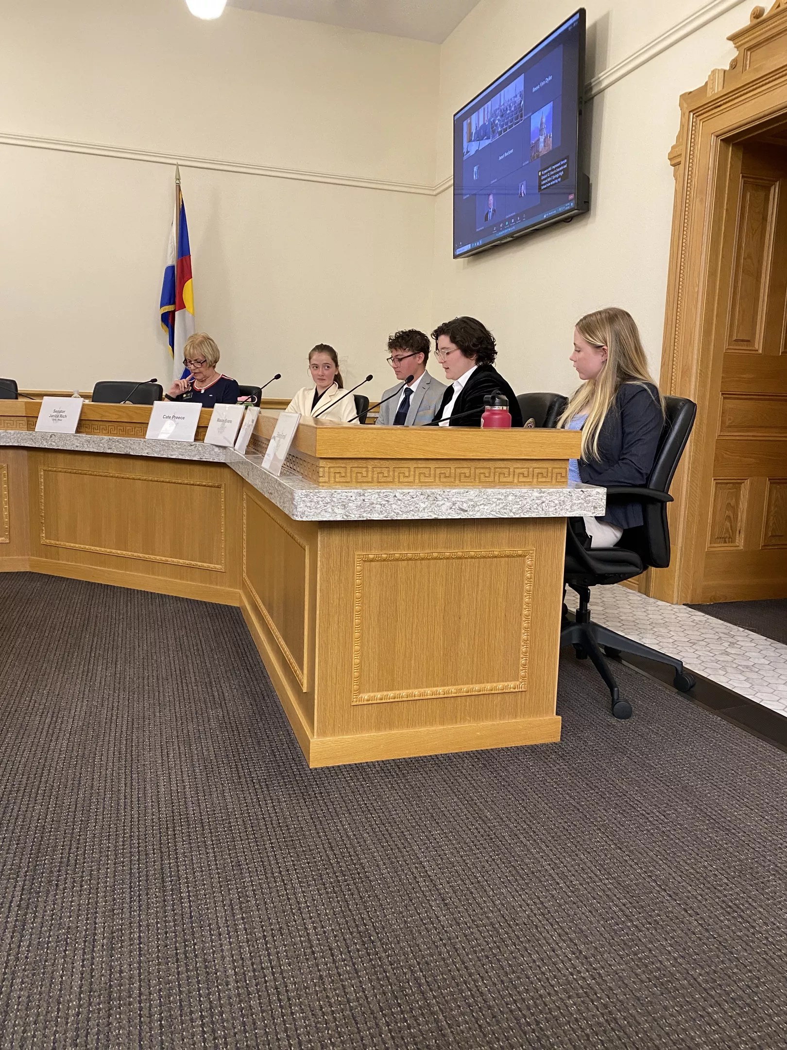 The Colorado Youth Advisory Council Interim Committee, which reviews the work of the Youth Advisory Council and recommends legislation, comprises three elected Democrats and two Republicans from the legislature, in addition to the seven youths selected for the program from the forty COYAC members.