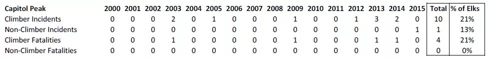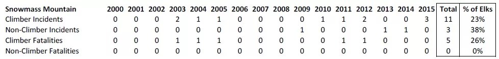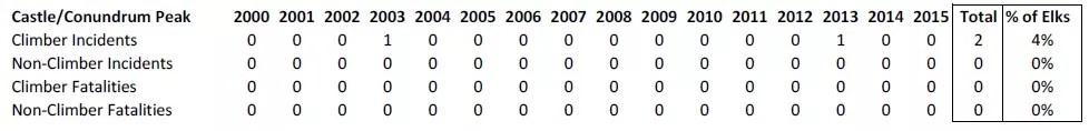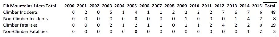 Still, he adds, “The Elk Mountains are among the least frequently climbed fourteeners in the state, but are disproportionately more likely to be the scene of fatalities due to their more technical nature and their notoriously loose rock. Even within this range, the most popular fourteener [Castle and nearby sub-peak Conundrum] is the least likely to see accidents/fatalities.”