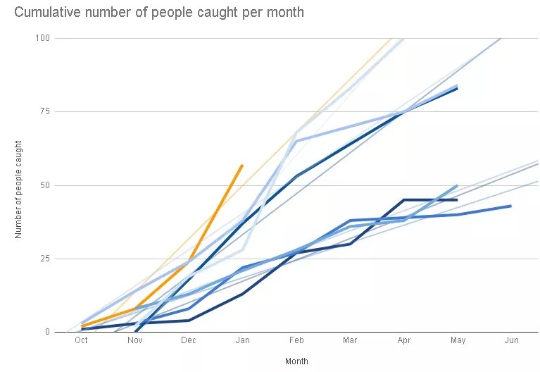This graphic depicts the number of people caught in Colorado avalanches per month from 2013 through January 2019.