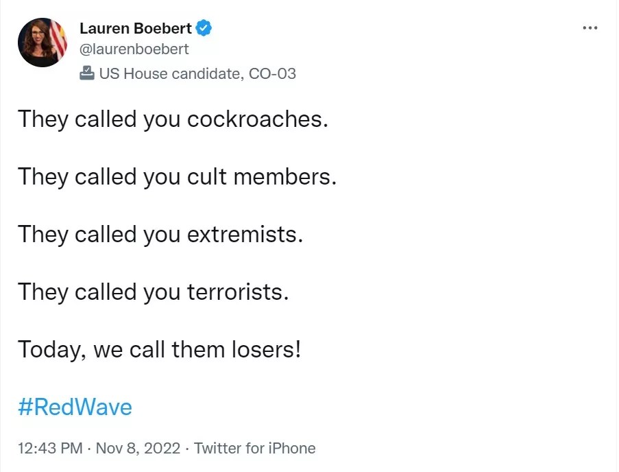 On Election Day, Boebert had tweeted out several predictions of a red wave, including one message at 6:40 p.m. that would age like pork sliders left out at a rodeo. “The red wave has begun. America First is winning!”