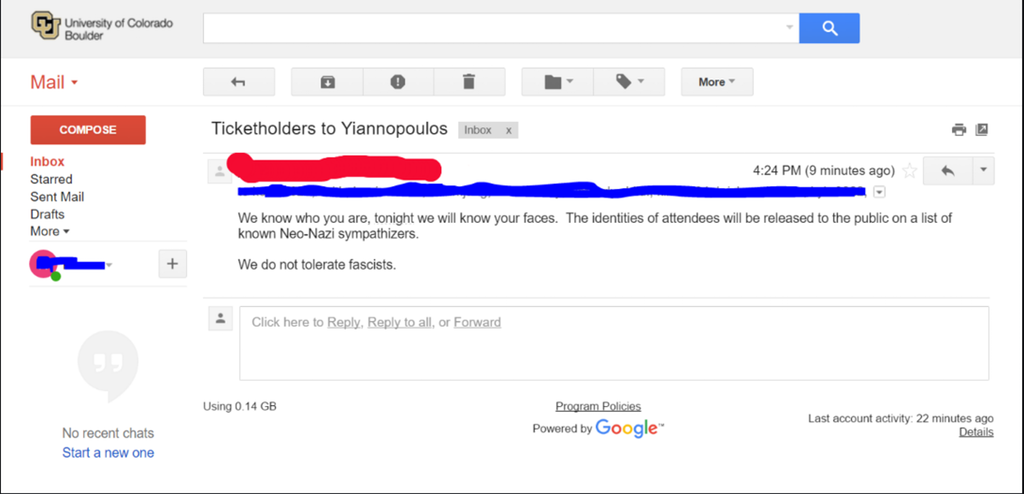 Update: Police at the University of Colorado Boulder continue to look into reports about an e-mail sent to ticket holders for a Wednesday night address by alt-right shit-stirrer Milo Yiannopoulos, threatening that “the identities of attendees will be released to the public on a list of known Neo-Nazi sympathizers.” See our previous coverage below.