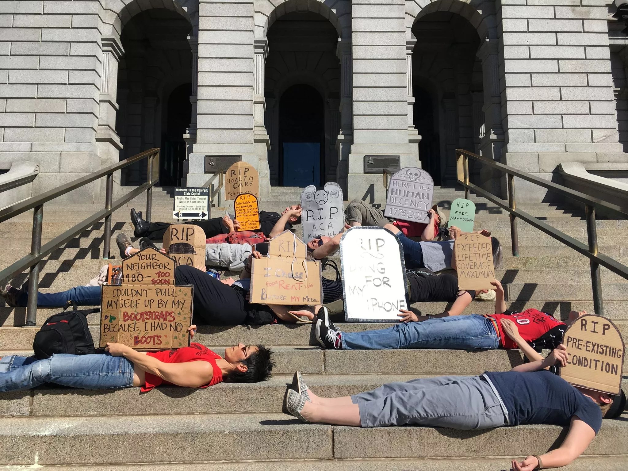 Starting about a month ago, Shumake and other Indivisible Denver members (the Facebook group has more than 5,000 members), launched the Sunday Gardner, and some of the demonstrations that followed have been elaborate. For one rally, he says, “we protested the attempted repeal of the Affordable Care Act with an old-fashioned die-in, where we came with cardboard tombstones and laid down in front of the building. Then we marched up the 16th Street Mall and died on the steps of the Capitol.”