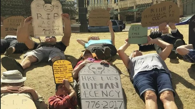 In an April post about the demonstrations, Shumake described one rally that took place at multiple locations: “We protested the attempted repeal of the Affordable Care Act with an old-fashioned die-in, where we came with cardboard tombstones and laid down in front of the building. Then we marched up the 16th Street Mall and died on the steps of the Capitol.”