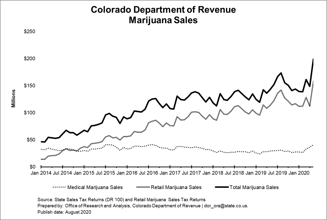 Initial state projections had marijuana revenue falling this summer, citing less tourism and falling wages because of the COVID-19 pandemic. After a bumpy March and April that brought regulatory changes and statewide stay-at-home orders, though, marijuana sales began rebounding, combining to bring in over $390 million in May and June. That’s about 25 percent higher than the total sales for the same two-month period in 2019.