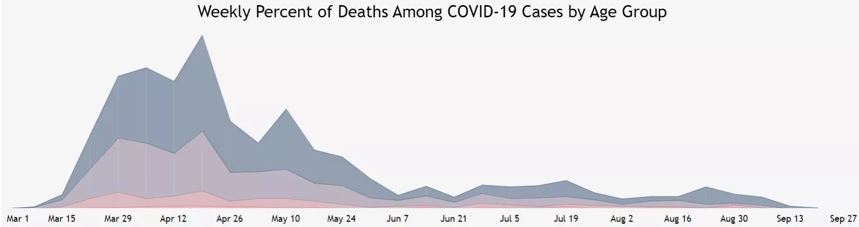 For the week of September 20, other demographic divisions accounted for a smaller slice of the COVID-19 total than did either of these categories: 23.48 percent of all cases were people between 40 and 59 years old, 9.37 percent of all cases were individuals between 60 and 79 years old, and 1.35 percent of all cases for people age 80 and above.