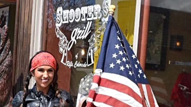 Lauren Boebert showing her colors outside Shooters Grill in Rifle.