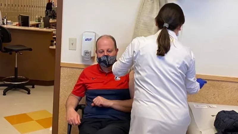 Colorado Governor Jared Polis getting vaccinated in late January.