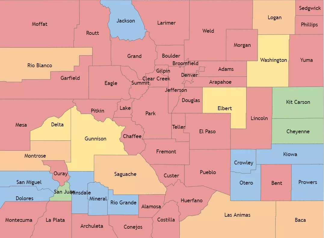 The CDC calculates the community level of COVID-19 as high in seventeen Colorado counties: Moffat, Rio Blanco, Garfield, Mesa, Montezuma, Routt, Eagle, Pitkin, Alamosa, Fremont, Pueblo, Otero, Prowers, Kiowa, Phillips, Sedgwick and Logan.