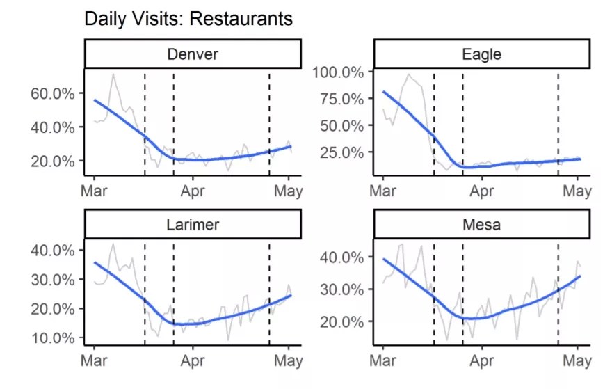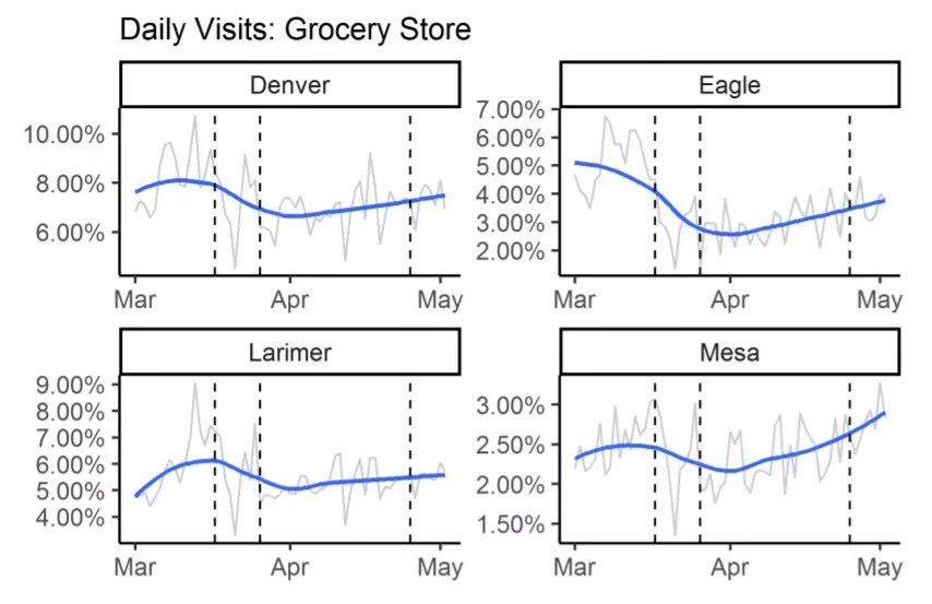 Another telling graphic involves the number of daily visits that Coloradans made to grocery stores. In March, during the peak of panic buying related to the pandemic, around 8 percent of Denver residents went to the market every single day. The numbers were lower for three other Colorado counties – Eagle, Larimer and Mesa – but in each, daily visits began creeping up as April turned to May.