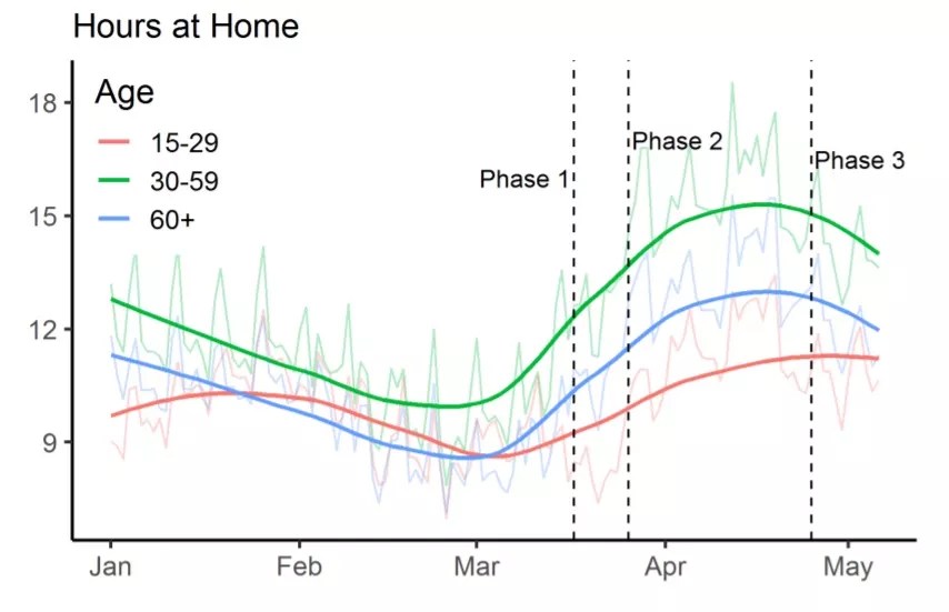 Residents between the ages of 15 and 29 spent the least time at home, but folks age 60 and above were out more often than were people between 30 and 59 – what are typically thought of as an individual’s prime employment years. In all likelihood, though, many of those in the last category were able to work remotely rather than heading into offices that may have been closed under the stay-at-home order.