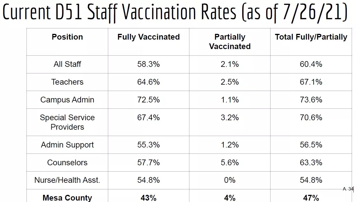 The vaccination rate among District 51 educators is higher than for Mesa County as a whole, according to a graphic in the plan that uses statistics from July 26. But more than 40 percent of staffers are not yet fully vaccinated, with that number rising to 45 percent-plus for nurses and health assistants. Here are those stats: