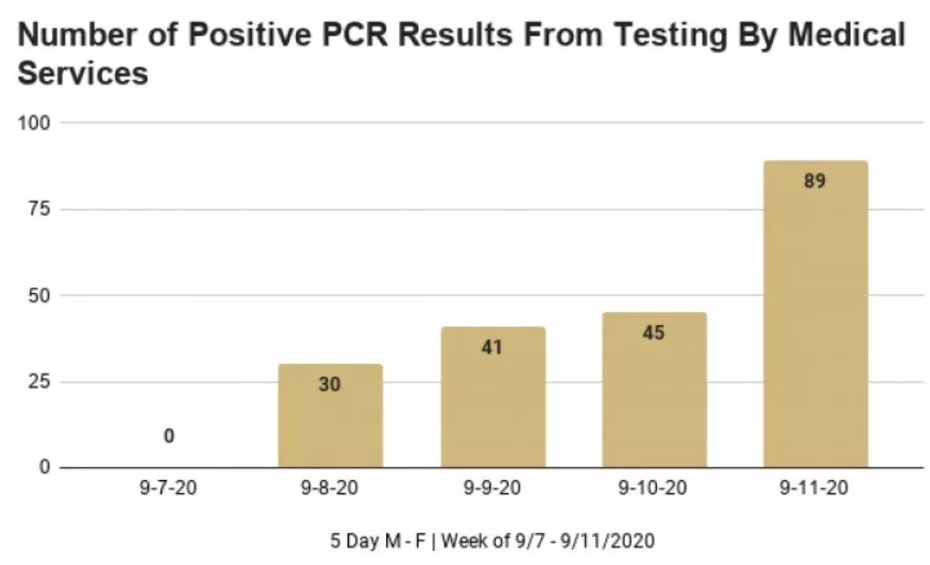 Meanwhile, positive cases began to ratchet upward at a concerning pace, as seen in this graphic shared last week on the CU Boulder COVID-19 data dashboard: