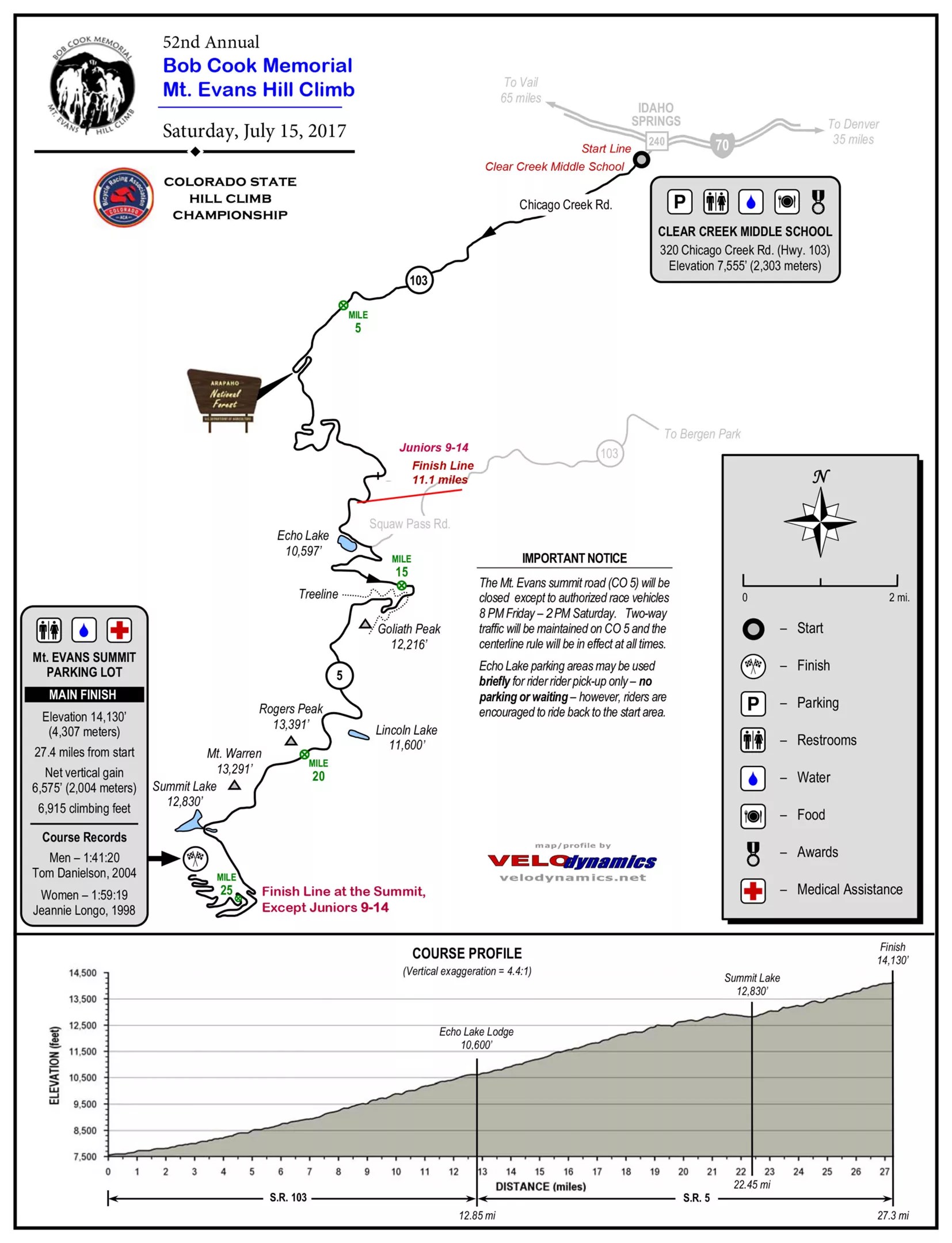 The annual Bob Cook Memorial Mt. Evans Hill Climb sends cyclists 27.4 miles straight uphill from an elevation of 7,500 feet in Idaho Springs to the peak of Mount Evans, at an elevation of 14,130 feet.