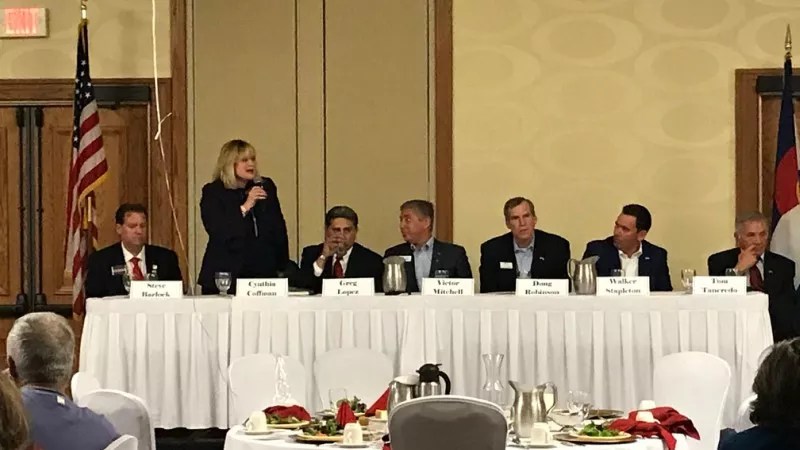 Cynthia Coffman speaking at a Republican gubernatorial candidate debate in January.