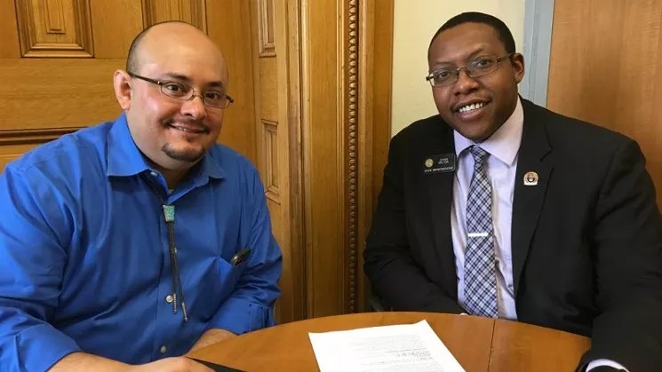 Representative Jovan Melton with Right to Rest act co-sponsor Representative Joseph Salazar, who spoke out on his behalf in the wake of domestic-violence allegations against him.