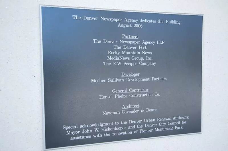 A plaque commemorating the joint operating agreement that involved the Rocky Mountain News and the Denver Post, photographed in 2009.