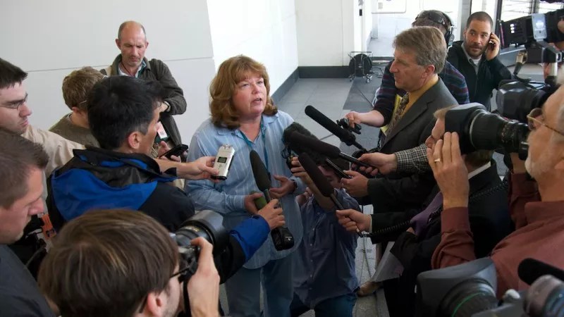 Former reporter Lynn Bartels meeting the press at the announcement of the paper’s closure. Bartels is currently the spokesperson for the Colorado Secretary of State’s Office.