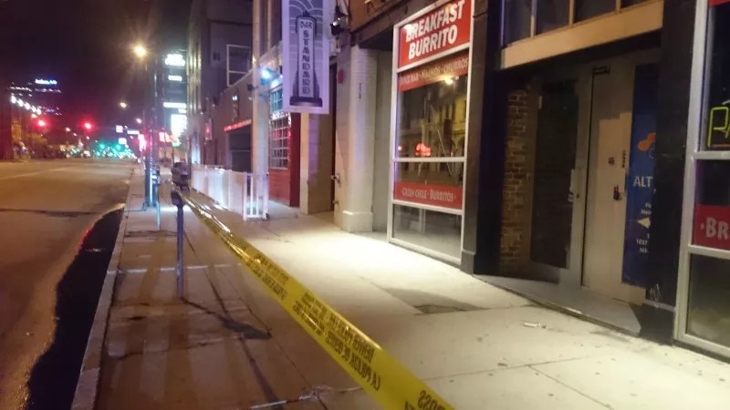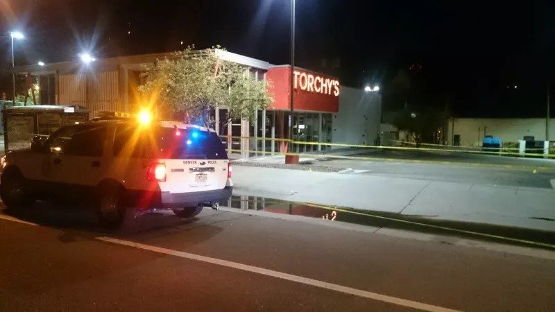 Given that Westword‘s offices are located just down the street, at 969 Broadway, I had no difficulty finding the nexus of activity. Crime-scene tape cordoned off an area just north of the EZPAWN, at 1025 Broadway – around fifty yards from our main entrance – and continued up the west side of the block past Torchy’s to the corner of 11th and Broadway.