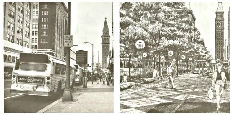 What 16th Street looked like in 1977 and an illustration from the original mall design.