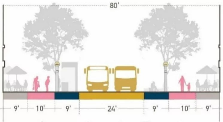 The new plan calls for the elimination of the median and larger areas on either side of the street.