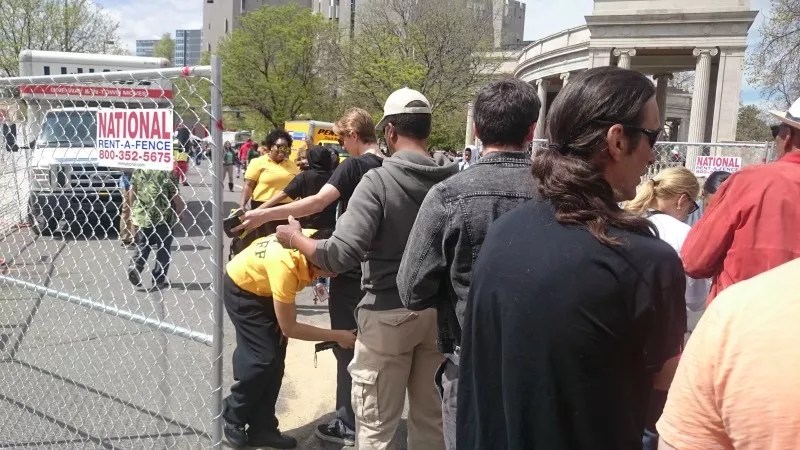 The weather for the bash held yesterday, April 20, was far better than it was in 2016, when a snowstorm forced a postponement until May 21. But an afternoon rain that ranged from drizzly to steady increased the misery of those who had to stand in line for an hour or more in some cases in order to gain entry to the festival grounds, which were protected by a fence that attendees eventually broke down in the minutes before the annual 4:20 p.m. countdown.
