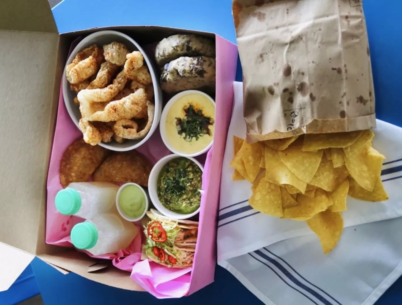 Mister Oso‘s 4/20 boxes — a collection of two margaritas, two Gordo Crunches (think Gordita Crunch from Taco Bell), two empanadas, a bag of BBQ chicharrones, small orders of queso and guacamole, a bag of tortilla chips and two “Big Ass” chocolate chip cookies — will be available all day for $50 each, with box options that come with Higher Grade dispensary gift cards.