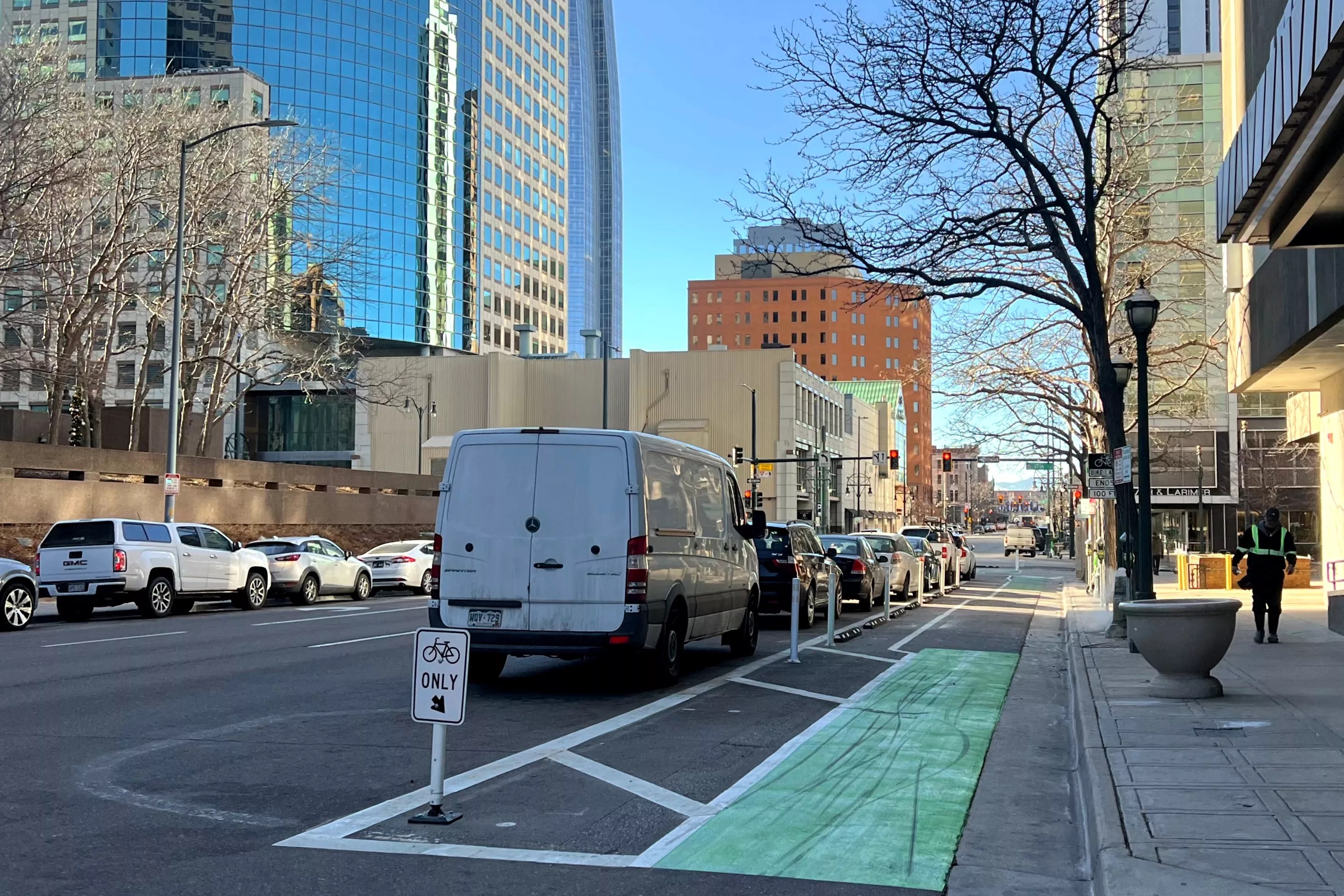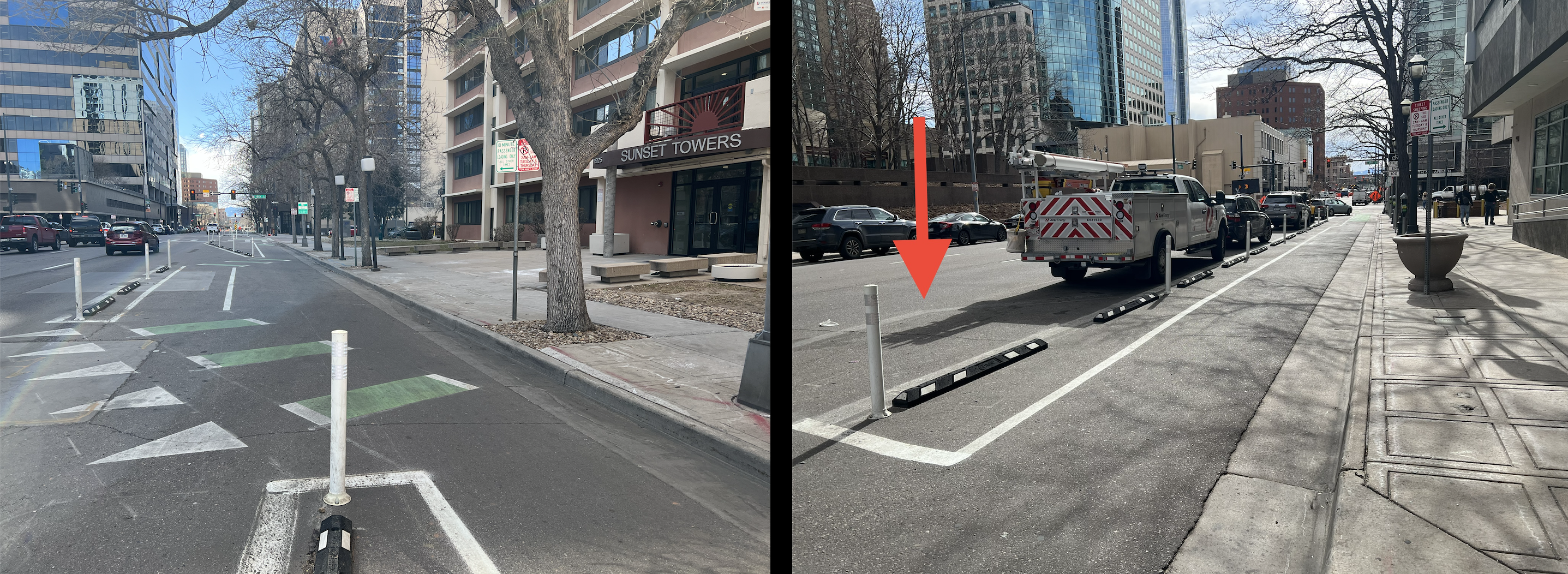 However, none of these changes are what the residents asked for. They want the same bike lane setup that’s outside the Sunset Towers senior living community, located just two blocks away on Larimer Street. At Sunset Towers, the bike lane bends around the building’s designated loading zone, so the loading zone is directly on the curb instead of being blocked by the bike lane.