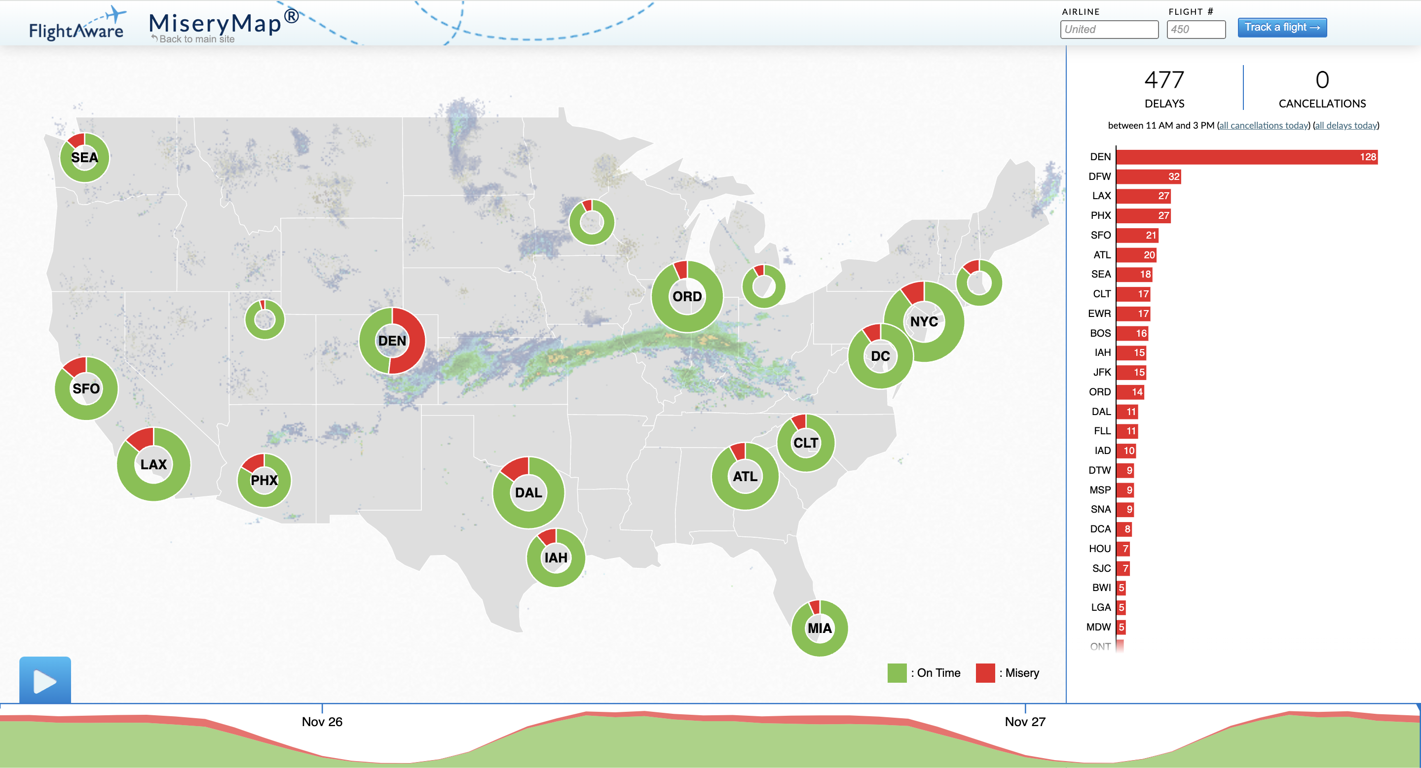 According to Flight Aware's Misery Map, the Denver airport currently leads the country in delayed flights.