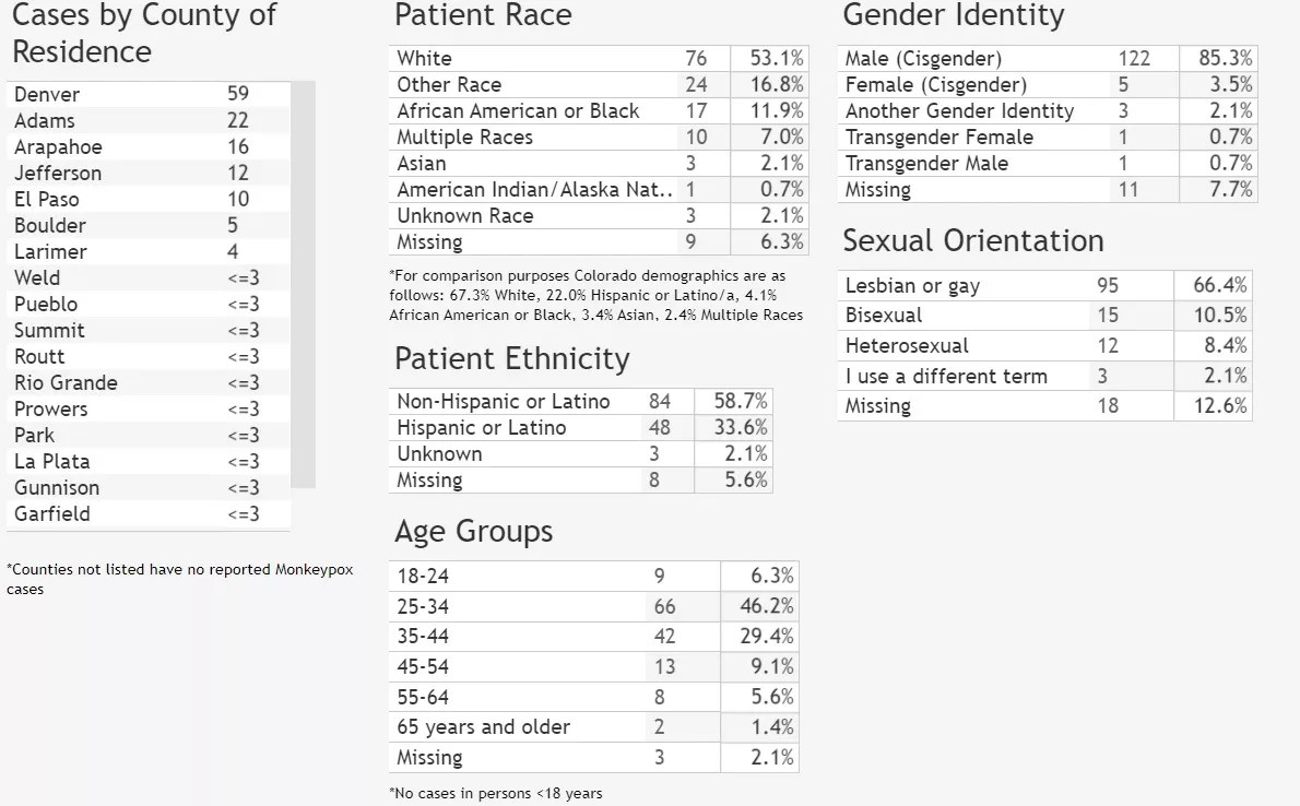 Here’s a graphic from the monkeypox data dashboard with assorted statistical breakdowns. Note that Douglas and Fremont counties have been linked to fewer than three monkeypox infections: