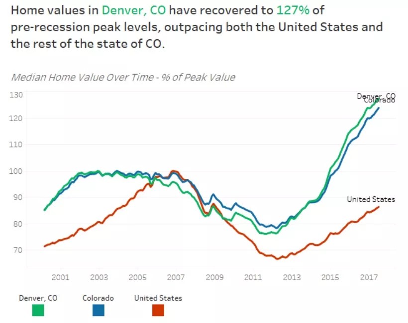 The Denver-Aurora-Lakewood metro area is doing much better than that, with median home values hitting 127 percent of the pre-recession figures. That makes Denver the most resilient city among the 100 largest American metros – and Colorado is considered the most resilient state in the country as a whole.
