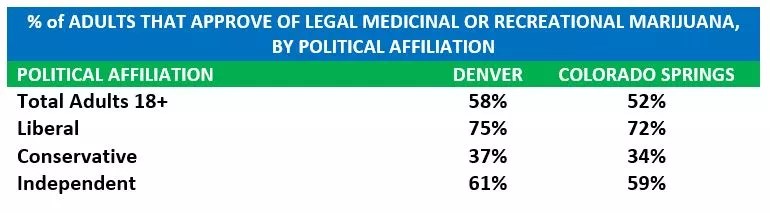 Although the majority of Colorado Springs liberals and independents support pot legalization, barely over a third of the city’s conservative population agrees. That low approval rating could hurt any recreational legalization effort in Colorado Springs, as nearly 40 percent of its residents consider themselves conservative, the report shows.