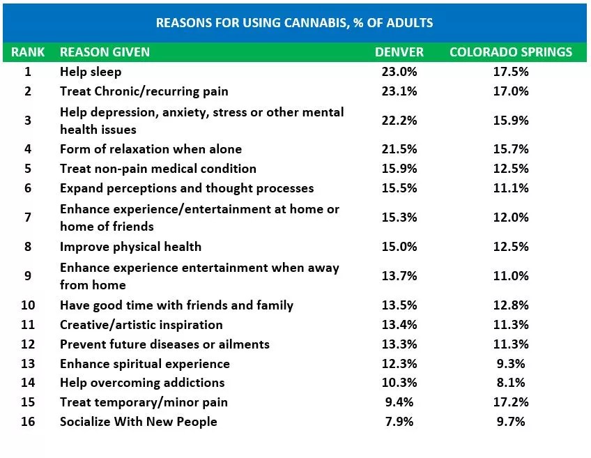 The big differences CRAC found were users’ reasons for consuming cannabis: Denver residents offered many more reasons for consuming cannabis. However, the ranking order is still similar, Stein notes: The top four reasons for using cannabis – help sleep, chronic pain, mental health issues and relaxation – were the same in both regions.