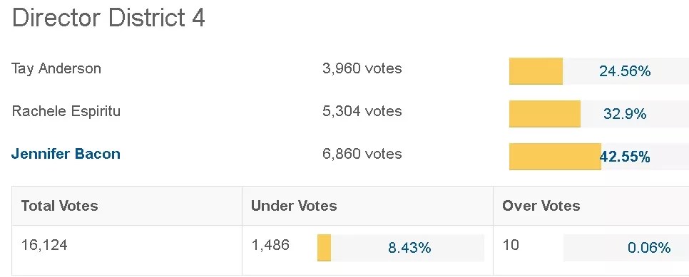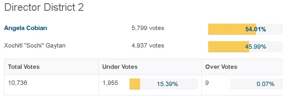 In the at-large board race, former Colorado lieutenant governor Barbara O’Brien, who is in favor of district reforms, is up on union-endorsed Robert Speth. In District 2, reformer Angela Cobián is topping Xóchitl ‘Sochi’ Gaytán, who won the union’s blessing. In District 3, Carrie Olson, a union-backed teacher, is leading pro-reform incumbent Mike Johnson. In District 4, union-supported challenger Jennifer Bacon is besting reform-minded incumbent Rachele Espiritu. See graphics for all of these contests below.